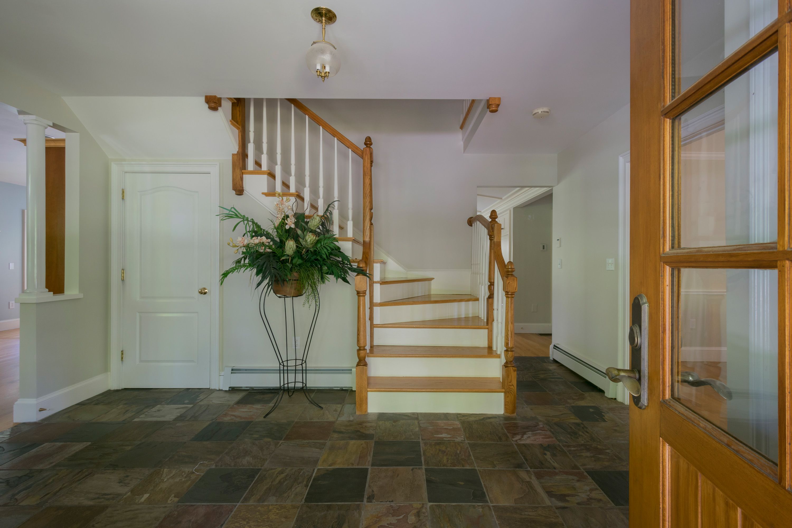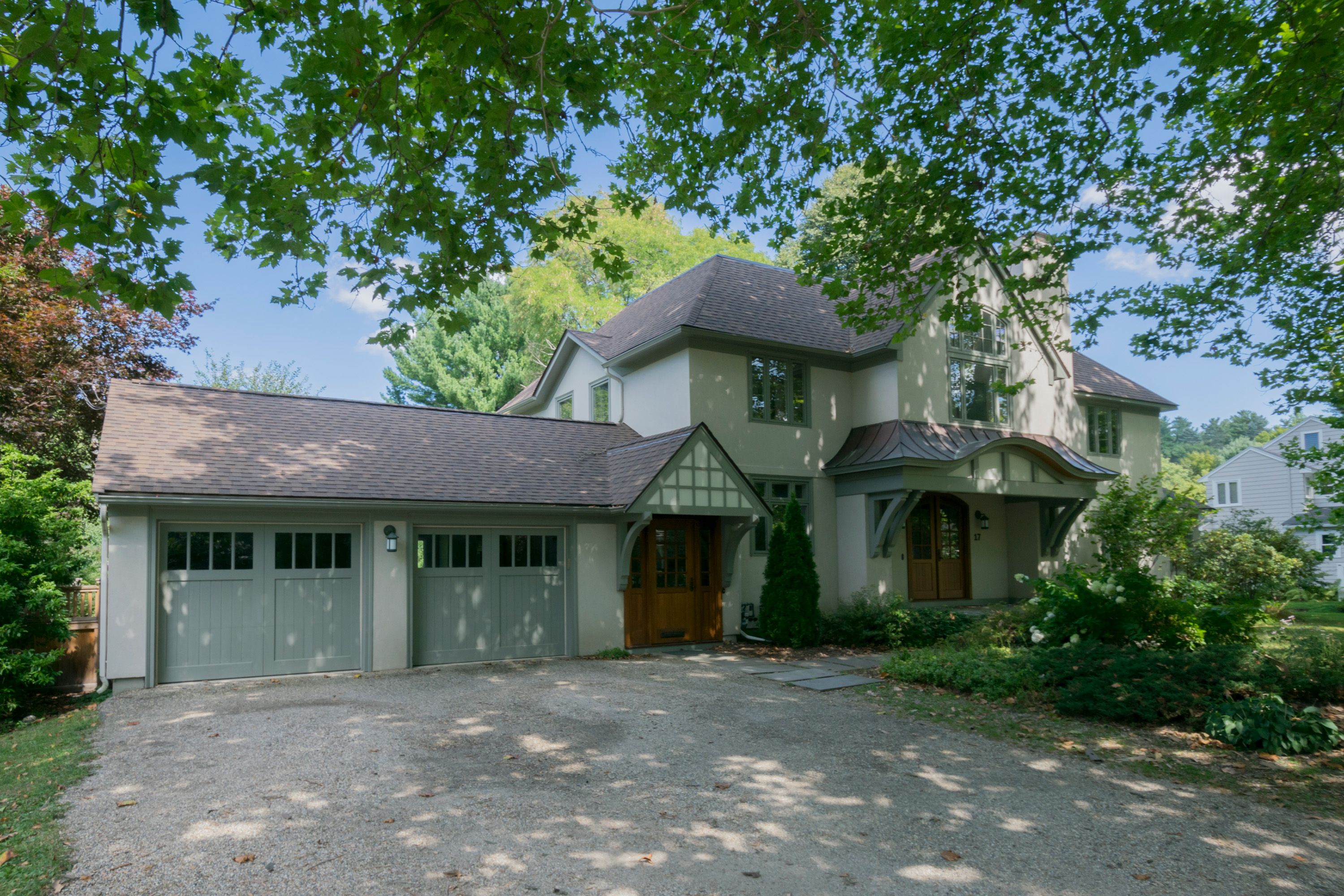 Quality, elegance, and modern style define this magnificent New England inspired home thoughtfully updated by recent renovations, all designed by renowned architect John MacDonald, and perfectly sited on a generous corner lot in the highly desirable Merriam Hill. The stately front porch is inviting with double mahogany arched doors, a mahogany ceiling, and designer sconces all beautifully framed by the impressive arched copper eyebrow awning for curb appeal galore. A second entrance provides easy access to the home’s mudroom beneath another eyebrow awning with a striking trellis design. The front gardens showcase perennial plantings along the pathways while large sycamore trees provide beauty and shade. The stunning front foyer features Indian slate floor tiles, an antique etched glass light fixture, and a lovely open staircase to the second level. Double French doors on the right side of the foyer draw you into the elegant formal living room. A half wall with decorative columns on the left side of the foyer offers a stylish and dramatic entrance into the gourmet kitchen. The foyer also offers direct access to the spectacular, open concept family room.