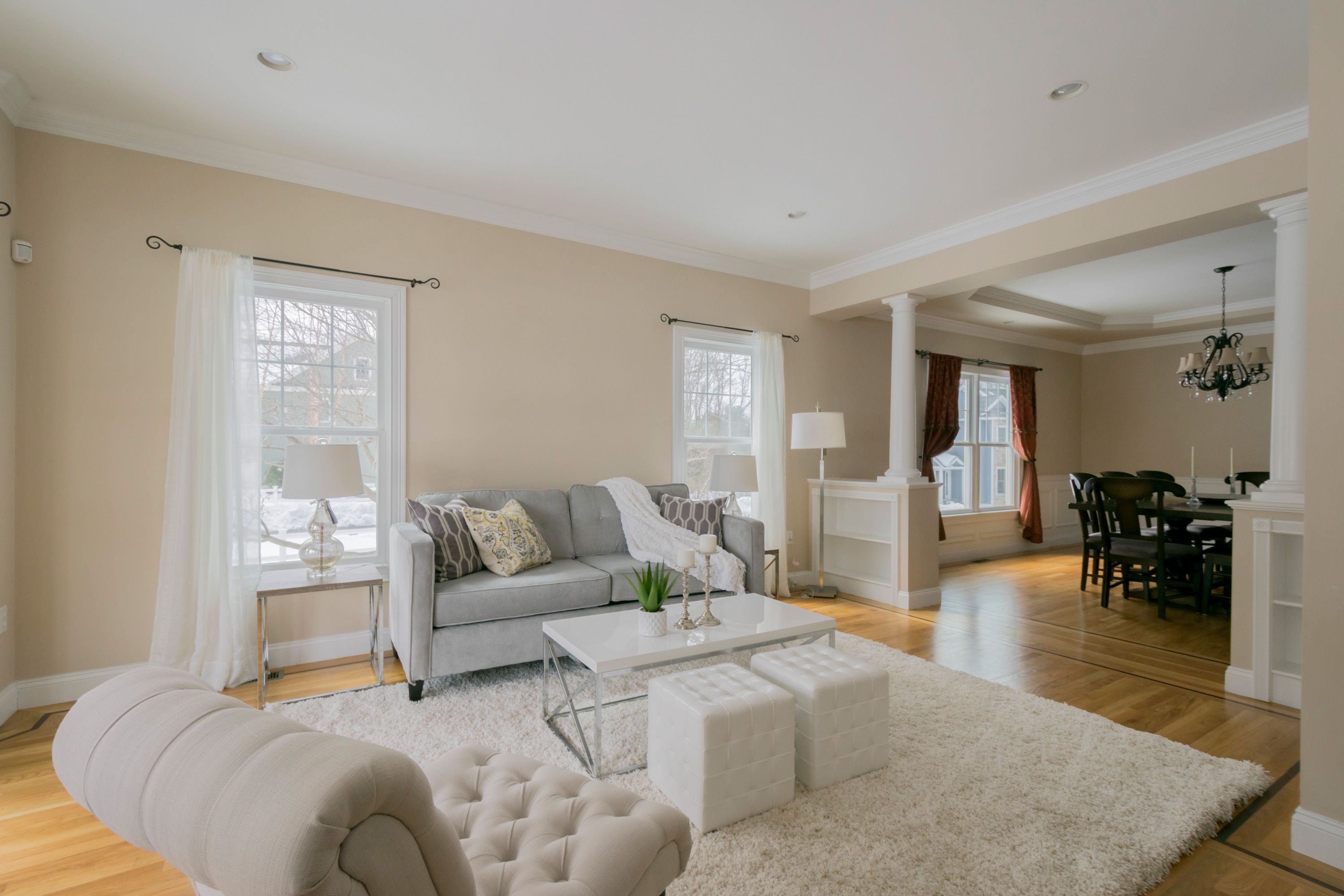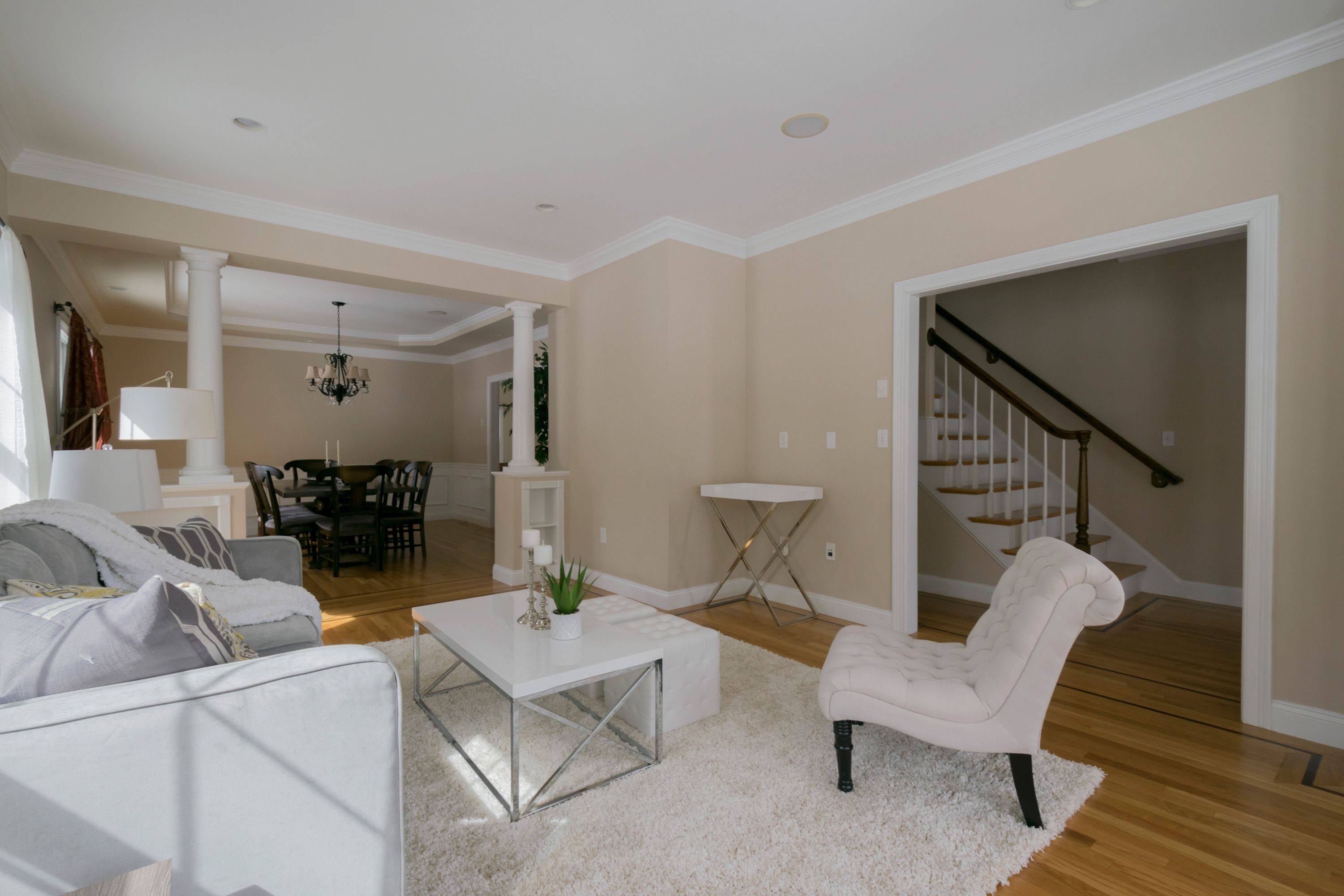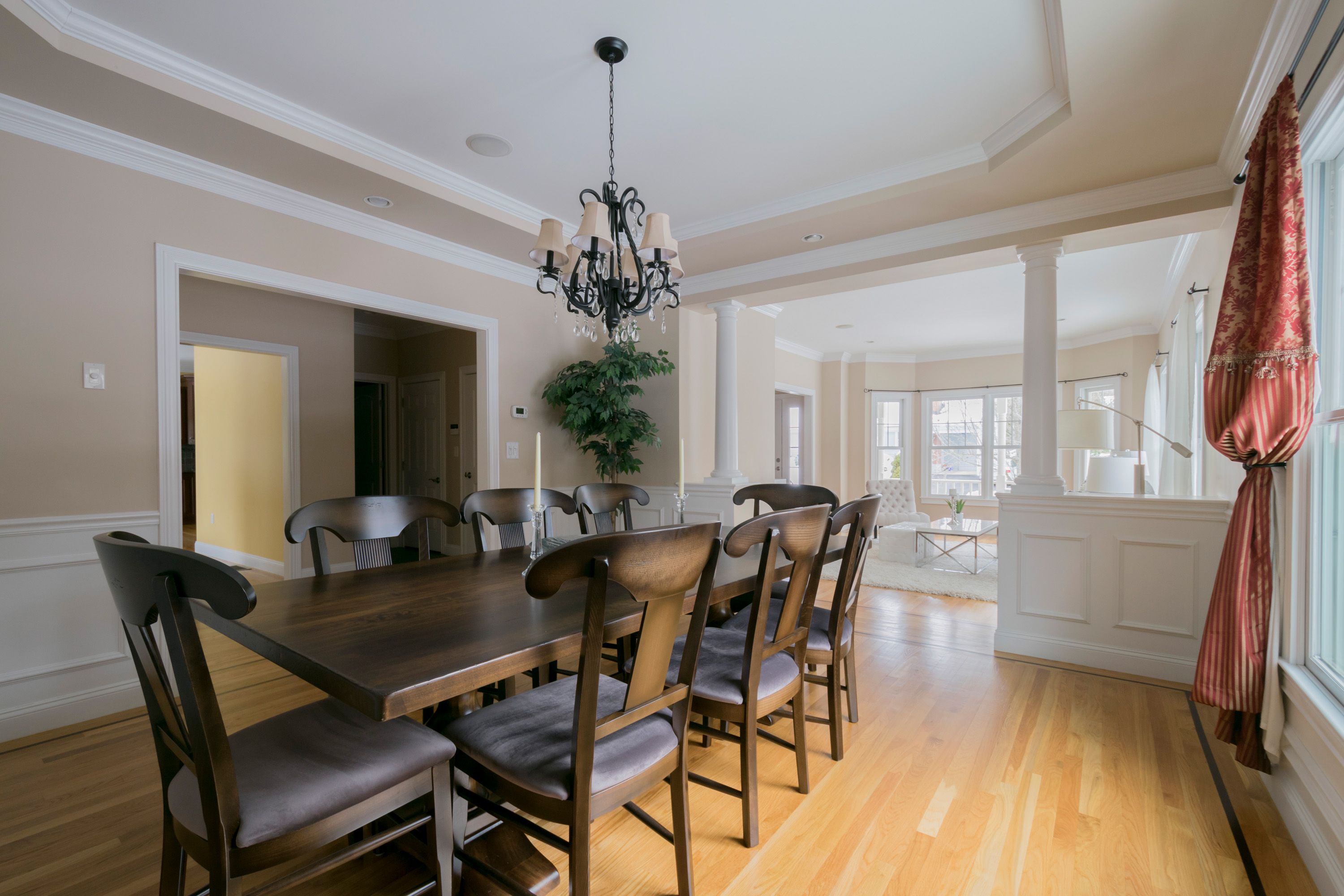 You will love coming home to modern style and curb appeal galore in this young Colonial, perfectly situated in a desirable neighborhood within walking distance to the town center. A farmer’s porch and an impressive front entryway welcome you into this thoughtfully designed and immaculate home offering an open and airy feel, gleaming hardwood floors, and light-filled spaces. A large cased opening on the left side of the foyer draws you into the open plan formal living room. Natural light streams through the large windows of the living room graced with shining hardwood floors, crown molding, and recessed lighting. A half wall with decorative columns and built-in shelving delivers a stylish and dramatic, yet seamless, transition to the open plan formal dining room. Imagine hosting special celebrations with family and friends in this beautiful room with shining hardwood floors, wainscoting, a double window, and crown molding. All eyes will be drawn to the striking tray ceiling accented by a lovely chandelier.